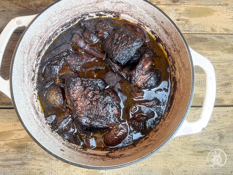 • Den Fond 2-3 Stunden einkochen lassen, bis er tief dunkel braun ist. Bei Bedarf Wasser oder Rotwein nachgiessen, so das immer ausreichend Flüssigkeit im Topf ist.