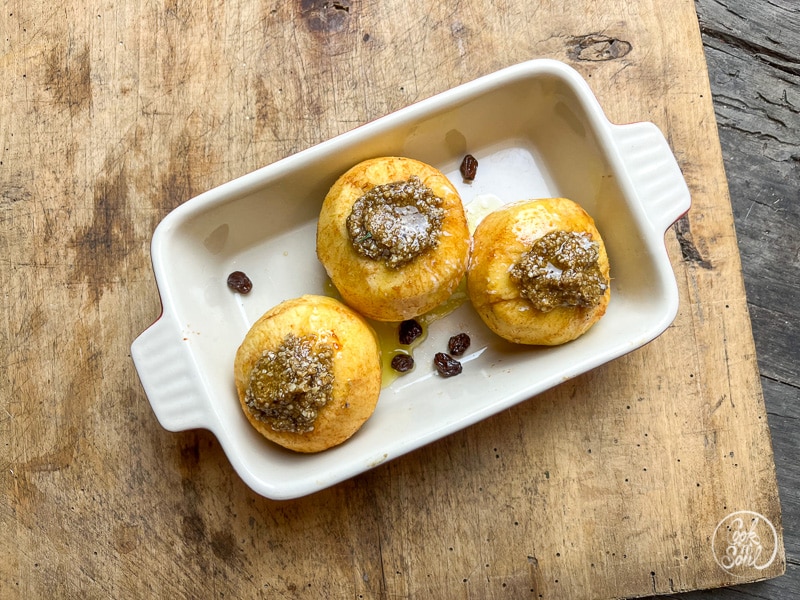- Mit einer Prise Zucker die Öffnung betreuen und die Äpfel in einer geeigneten Backofenform ca. 30 Minuten im vorgeheizten Backofen bei 190 Grad überbacken.