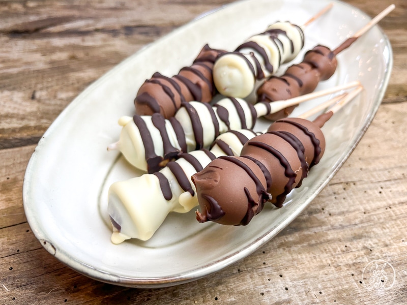 - Schokolierte Spieße auf dem Backpapier ablegen und auskühlen lassen, bis die Schokolade fest geworden ist.