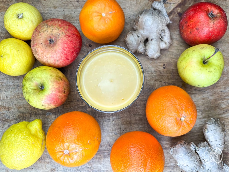 Orangen sind regelrechte Vitamin C Bomben, aber sie enthalten auch den sekundären Pflanzenstoff Polyphenol, der antioxidativ wirkt und das Immunsystem stärkt. Vitamin C ist nicht nur gut bei Erkältung da es das Immunsystem pusht, es ist auch ein ausgezeichnetes Antioxidans und ein Fänger freier aggressiver Radikale, die im Körper schaden anrichten. Außerdem enthalten Orangen Vitamin B, das im Gehirn das Glückshormon Serotonin ausschüttet, vom frisch gepressten Orangensaft in diesem Apfel Orangen Smoothie mit Kiwi und Ingwer bekommt man also gute Laune..