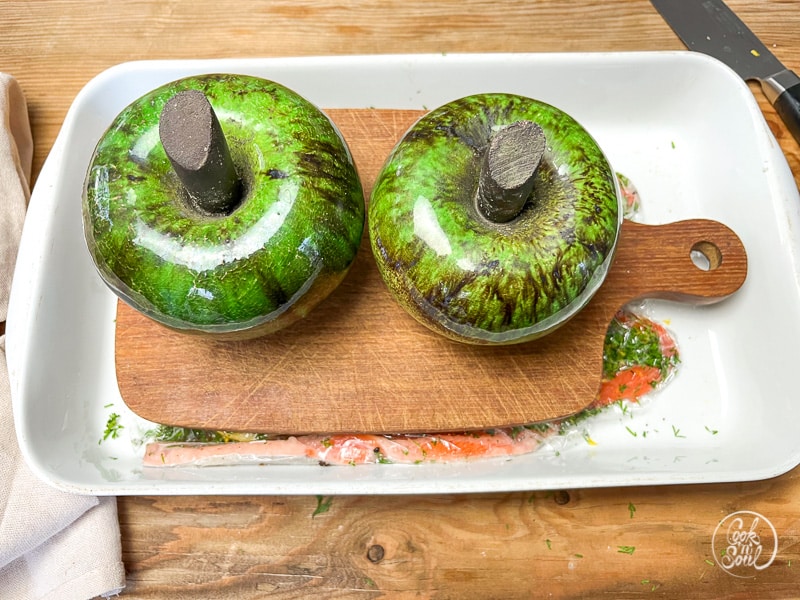 - Jetzt muss der Lachs für mindestens 2 Tage kalt gestellt werden und durchbeizen. Beim Beizen entsteht meist ein bisschen Lake in der Form, das ist völlig normal und gar nicht schlimm 😉