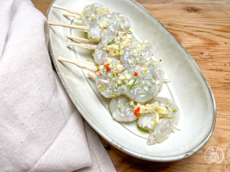 - Garnelen schälen und bei Bedarf den Darm am Rücken entfernen. Dann die einzelnen Garnelen aufspießen, so dass Du eine gerade Zahl an Garnelenspießen hast.