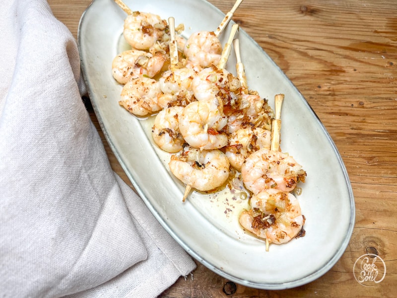 - In einer ausreichend großen Pfanne etwas zusätzliches Öl erhitzen und die Garnelenspieße darin 1 Minute von jeder Seite scharf anbraten.