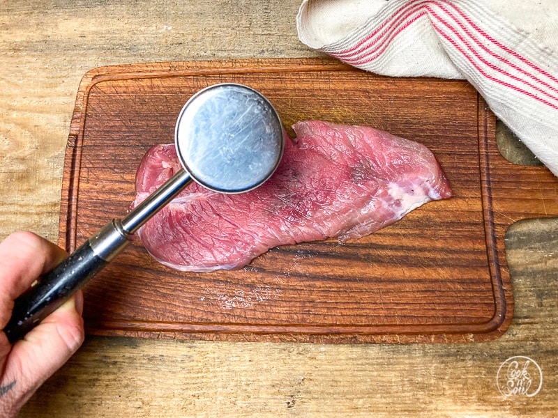 - Die Größe der Schnitzel kann sich durch das Klopfen nahezu verdoppeln, aber Du musst aufpassen, dass Du nicht zu doll klopfst und Löcher in das zarte Fleisch haust 😉