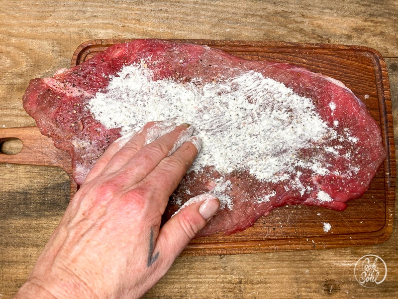 - Zuerst das Fleisch unter kaltem Wasser waschen, mit einem Küchentuch abtrocknen und dann mit dem Fleischklopfer von beiden Seiten klopfen.