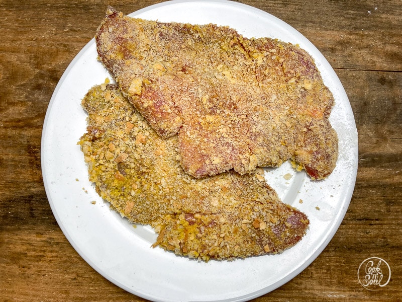 - Danach von beiden Seiten durch die geschlagenen Eier ziehen. Jetzt die Schnitzel beidseitig mit den Semmelbröseln bedecken und mit den Handflächen andrücken. Die Panade sollte ausreichend dick sein und keine Löcher haben, damit das Schnitzel schön gleichmäßig ausbraten kann und rundrum knsuprig wird.