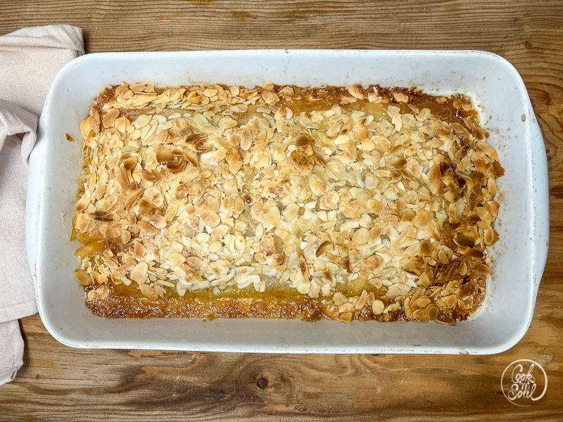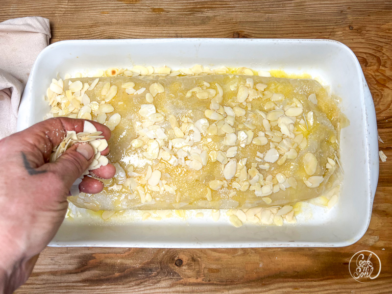 - Die Oberseite des Strudels dick mit flüssiger Butter einpinseln, die Mandelblätter darüber streuen und mit dem restlichen Zucker gleichmäßig bedecken.