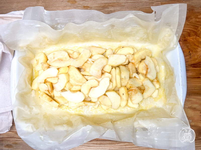 - Filo-Teigblätter in doppelter Lage auf der Form ausbreiten, dabei die untere Lage mit flüssiger Butte einpinseln und eine Prise Zucker drauf verstreuen.Dann die Äpfel in der Mitte verteilen mit etwas Zucker bestreuen und etwas von der Butter darüber geben.
