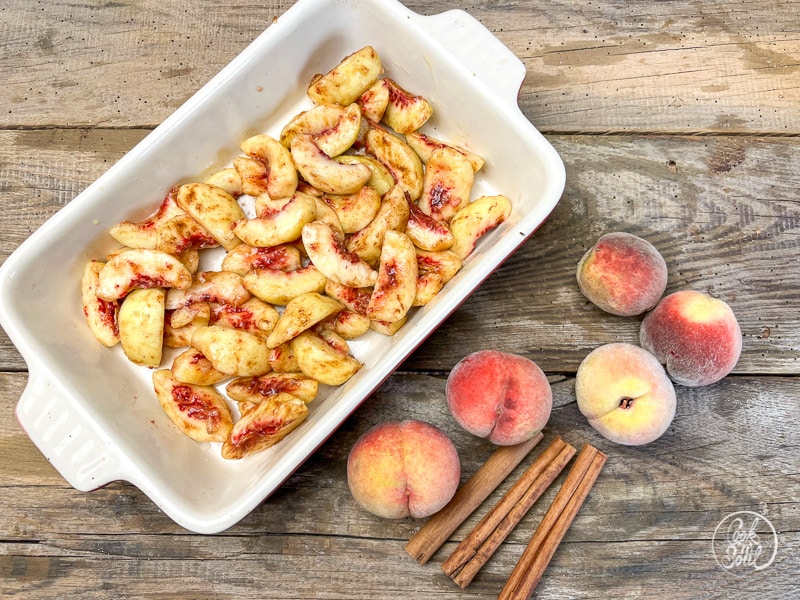 - Die Pfirsiche waschen, entkernen, (optional schälen) und in gleich große Spalten schneiden, in der Ofenform verteilen und mit dem Zimt bestäuben.