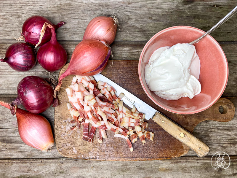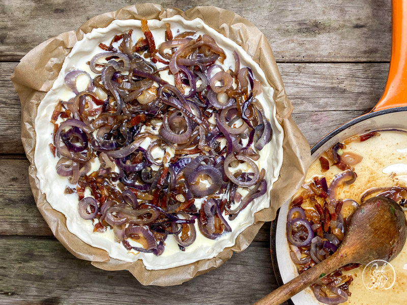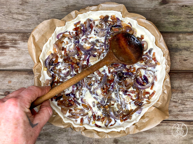 - Backofen auf 180 Grad vorheizen. Die Zwiebeln und den Speck etwas in die Schmandcreme hineindrücken, damit sie beim Backen damit schön verschmelzen.