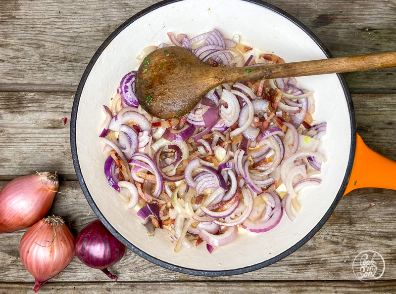 - In der Zwischenzeit den Speck in einer ausreichend großen Pfanne (ohne zusätzliches Fett) ausbraten, bis er schön knsuprig ist. Zum Schluß die Zwiebeln kurz dazu geben und mit einer Prise Zucker (optional) karamellisieren lassen.