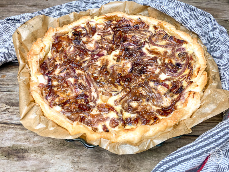 - Du kannst den fertigen Zwiebelkuchen heiß oder leicht abgekühlt genießen.