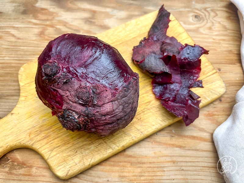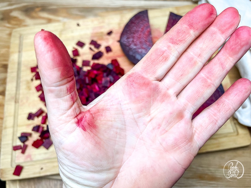 Tipp: in den meisten Rezepten heißt es, dass die Rote Bete fürchterlich färbt und man unbedingt Einweghandschuhe tragen soll. Ich hate das für Quarsch, denn die Farbe lässt sich natürlich auch ganz leicht wieder von den Fingern abschrubben 😉