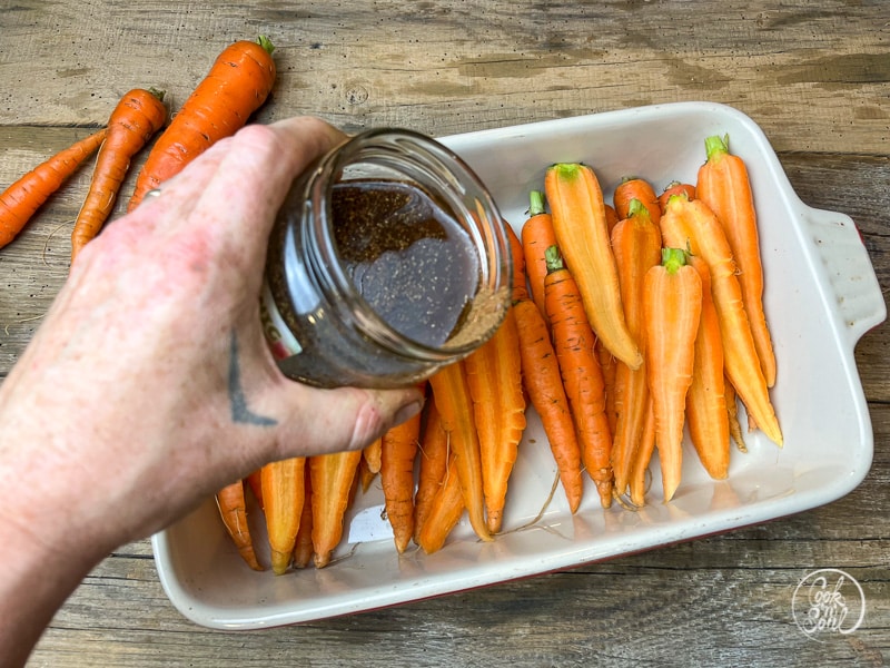 - Backofen auf 175 Grad vorheizen. Zitronenschale, Thymian, Knoblauch, Balsamico, Ahornsirup, Sesam und Olivenöl miteinander vermengen und gleichmäßig über die Karotten geben, so dass sie vollständig mit Marinade bedeckt sind. In einer Backofenreine oder auf dem Blech in den Ofen schieben und ca. 15 Minuten bei 175 Grad garen.