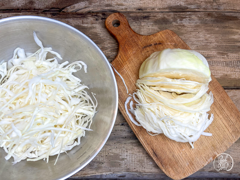 - Die äußeren Blätter des Kohlkopf werden entfernt, denn sie sind oft schon etwas beschädigt oder welk, außerdem spart man sich dadurch auch gleich das Waschen. Kohl halbieren, den Strunk rausschneiden und die beiden Hälften in sehr feine Streifen aufschneiden. Tipp: wer eine gute Brotmaschine hat, kann den Kohl damit fein aufschneiden, ansonsten funktioniert es auch gut mit einem großen Küchenmesser.