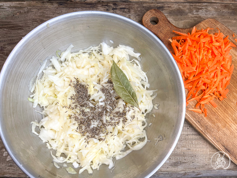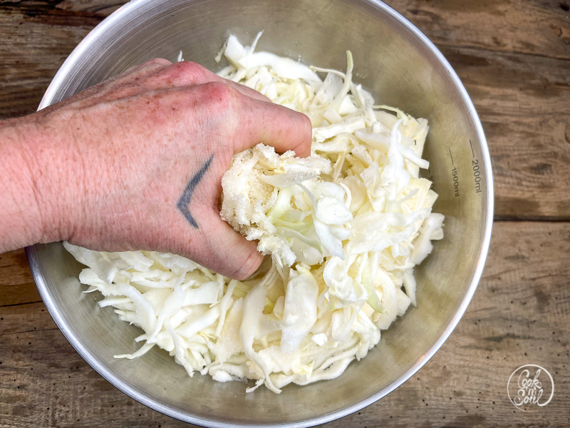 - Kohl, Salz und Zucker in eine große Schüssel geben und alles gründlich miteinander vermengen. Jetzt wird solange geknetet, bis der Kohl in seinem eigenen Saft schwimmt. Das kann 10-15 Minuten dauern, je länger und fester man die Kohlschnipsel quetscht, um so besser ist das Ergebnis.