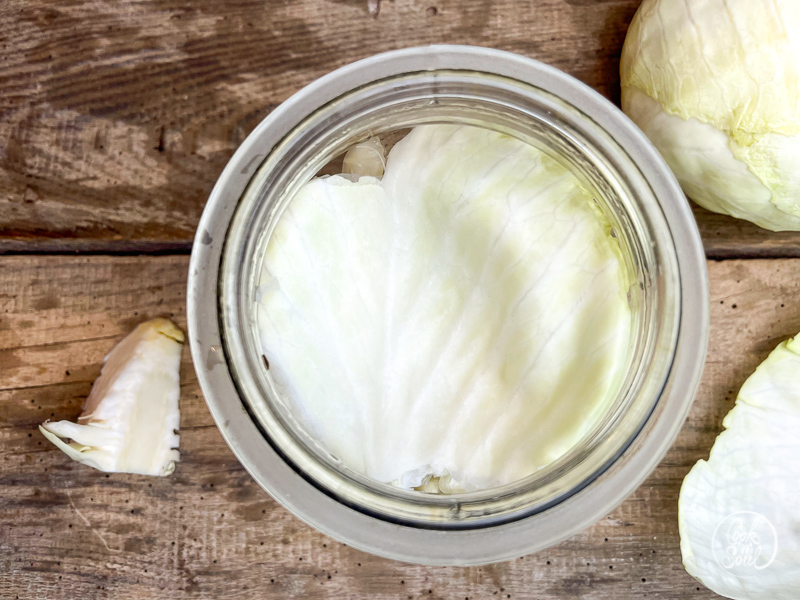 - Auch der Kohlsaft aus der Schüssel kommt mit ins Glas und wenn er nicht ausreicht, den Kohl kompltt zu bedecken, dann musst Du das Glas mit etwas heißem Wasser auffüllen. Der Kohl muss komplett in Flüssigkeit liegen, also immer wieder nach unten drücken und Flüssigkeit nachfüllen.Zum Schluß ein Kohlblatt oben drauf legen und das ganze mit einem Gewicht beschweren.