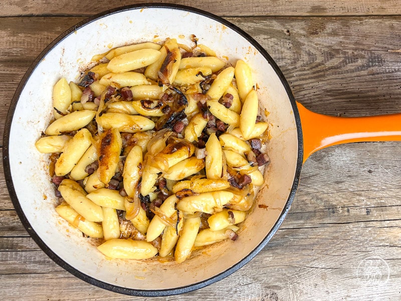 - Zwiebeln und Speck in eine Pfanne geben und knusprig anbraten. Fertig gekochte Schupfnudeln dazu geben und ebenfalls anbraten, bis sie leicht braun werden.
