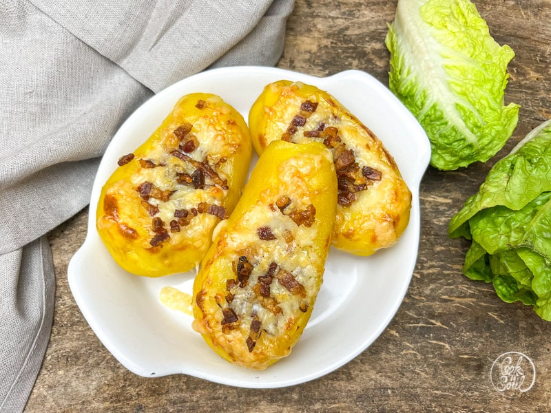 Die überbackenen Kartoffeln sind ein tolles kleines Essen, aber auch als Beilage harmonieren sie mit vielen schönen Gerichten. Der klassische Begleiter vieler Schweinebraten Rezepte sind Kartoffelknödel und zum Rinderbraten Rezept sind grüne Bohnen im Speckmantel der Klassiker, aber als Alternative passen die überbackenen Kartoffeln hervorragend dazu, vor allem wenn sie mit einem einfachen grünen Salat oder zum Schweinebraten natürlich mit einem Krautsalat kombiniert werden.