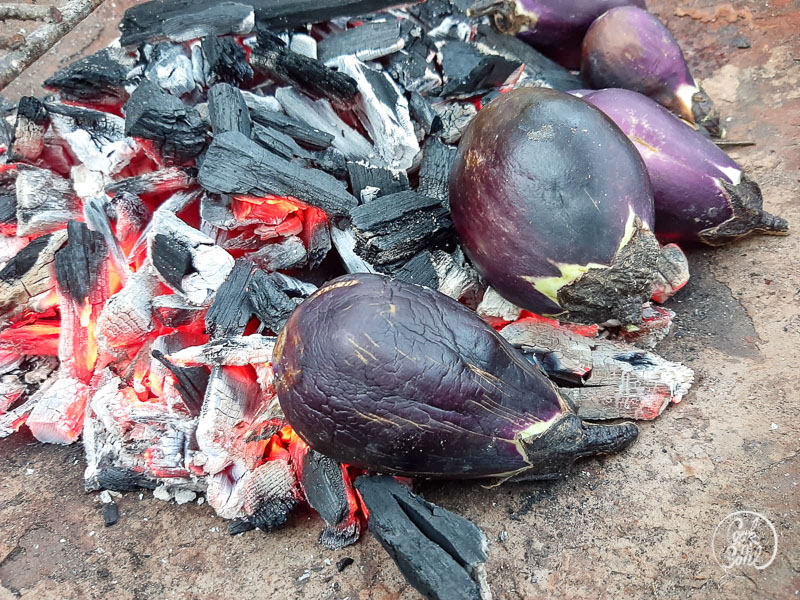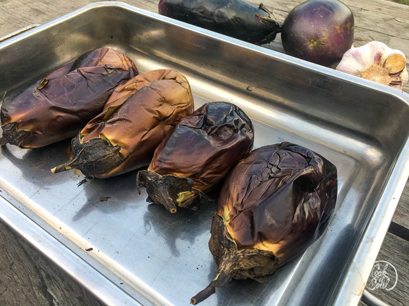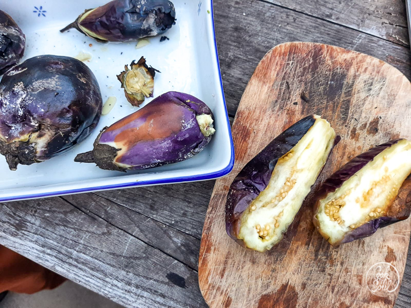 Die Zubereitung über der offenen Gasflamme funktioniert genauso, ist nur etwas aufwändiger, da man beim Verbrennen mit seiner Aufmerksamkeit dabei sein muss. Man legt die Auberginen direkt aufs Feuer und lässt sie unter mehrfachem Wenden verbrennen. Wenn sie weich sind, wird ihr Fleisch herausgekratzt und mit den anderen Zutaten weiterverarbeitet. Der Herd sieht danach meistens aus wie ein Schlachtfeld, weshalb Profis ihn vorab mit Alufolie auskleiden.