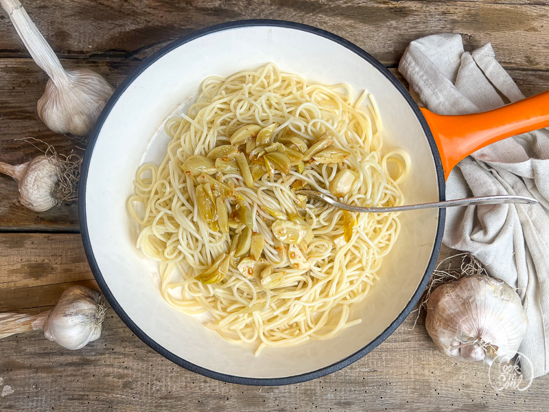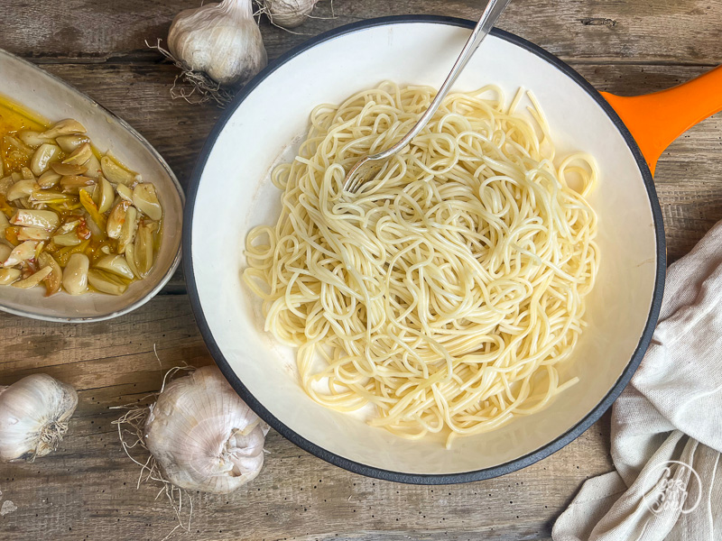 - Fertig gekochte Pasta in eine Pfanne mit etwas Butter geben und den Knoblauch untermengen.