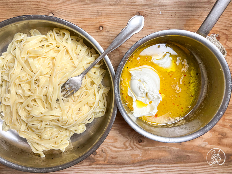 Wer den Ehrgeiz hat, kann die Pasta selber machen, denn auch dicke Nudeln wie selbstgemachte Tagiatelle schmecken dazu köstlich. Wir verwende am liebsten Hühnerbrühe für die Sauce, denn sie gibt ein vollmundiges Aroma, wer es vegetarisch oder vegan belassen möchte nimmt einfach kräftige Gemüsebrühe.