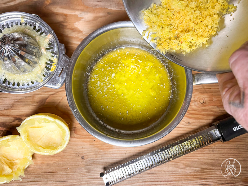 - Butter erhitzen, Zitronensaft und Zitronenschale hinein geben und 10 Minuten leicht kochen lassen, damit die Butter an Wasser verliert (Ghee-Effekt).Tipp: durch zu langes Kochen verliert der Zitronensaft an Säure, ohne sein herrliches Aroma einzubüßen. Wer eingelegte Salzzitronen hat, kann auch diese statt der frischen Zitrone verwenden.