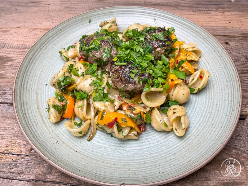 Diese Pasta mit Hackfleischbällchen ist ein tolles Rezept für die ganze Familie. Saftiges Hackfleisch, in der Pfanne gebraten, dazu eine cremige Sauce mit frischem Gemüse. Lecker und gesund 😉