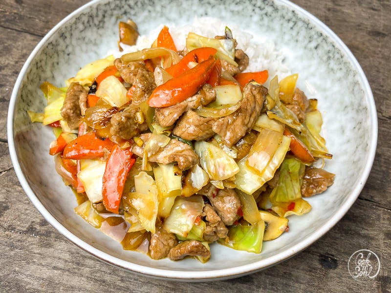 Asiatischer Reis mit Schweinefilet und süß saurem Gemüse
