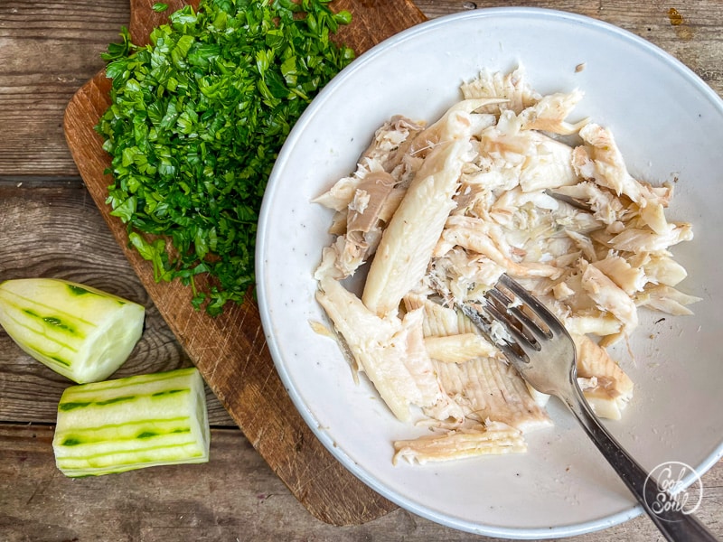 • Forellenfilets mit der Gabel zerkleinern, das geht ganz einfach, weil das geräucherte Fischfilet schön weich ist.