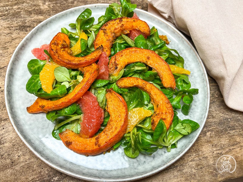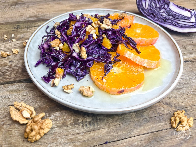 Nicht nur bei der Salatsauce kommen die Aromen der Zitrusfrüchte gut an, auch filetierte Orangen sind immer eine schöne Ergänzung auf dem weihnachtlichen Salat. Ein echter Klassiker ist der puristische Orangensalat und der bunt gemischte Zitrussalat, die sowohl zur traditionellen Weihnachtsgans als auch zum vegetarischen Weihnachten hervorragend passen. Und auch mein Feldsalat mit gebackenen Kürbisspalten und Orange oder der Karottensalat mit Orangen, Rosinen und Sesam sind ein schönes Aromenspiel beim Festmahl.