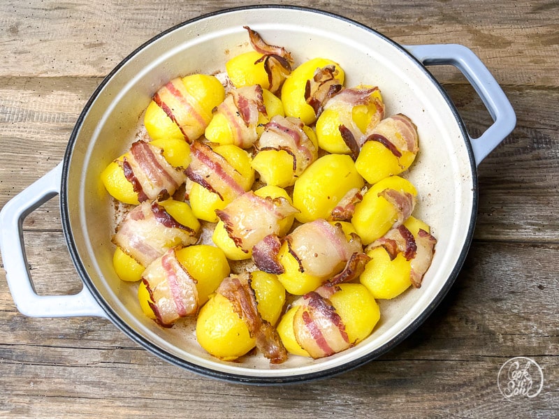 Zuerst werden die mit Speck umwickelten Kartoffeln auf dem Herd von der Unterseite her knusprig angebraten, das gibt schöne Röstaromen. Dabei die Kartoffeln nicht wenden.