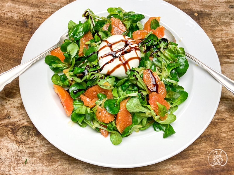 Mozzarella Burrata mit Feldsalat und Zitrusfrüchten