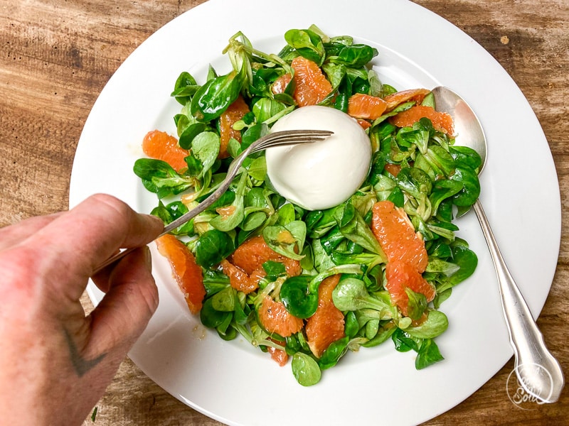 Die Burrata ist eine besondere Form des Mozzarella. Handgefertigt, mit einer cremigen Portion Rahm im Innern, gilt dieser Mozzarella als Spezialität. Dazu passt ein feiner Feldsalat und Grapefruit, Zitronen, Orangen bzw. Blutorangen.