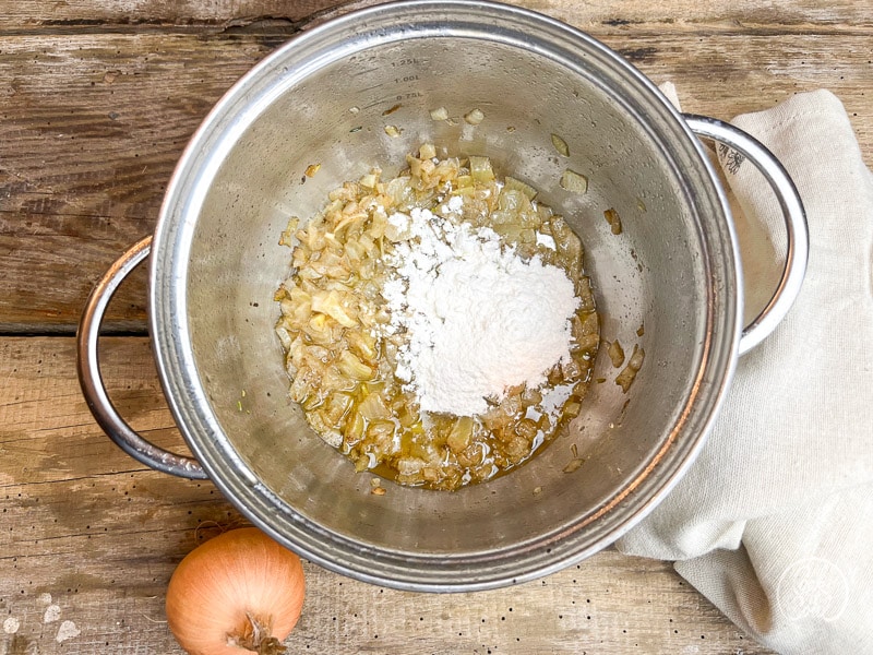 - Das Mehl einrühren und zur Mehlschwitze bräunen.