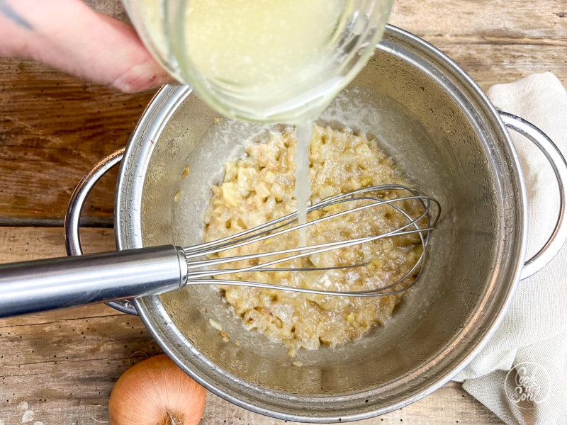 - Sobald das Mehl in der Butter leicht gebräunt ist, die Brühe unter ständigem Rühren aufgießen und auf kleiner Flamme leicht andicken lassen.