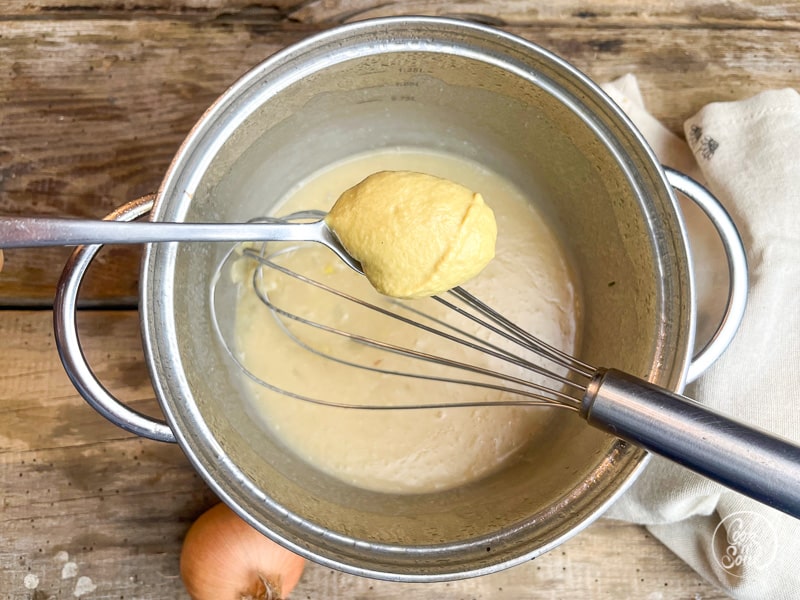 - Dann den Senf einrühren und die Sauce mit Balsamicoessig, Salz und Pfeffer würzen.