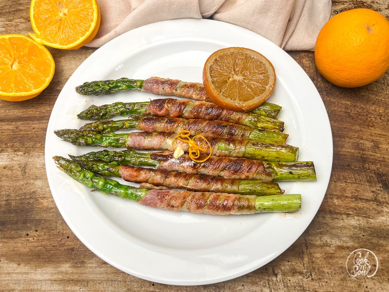 Gebratener grüner Spargel: mit Schinken und Zitronen Honig Sauce