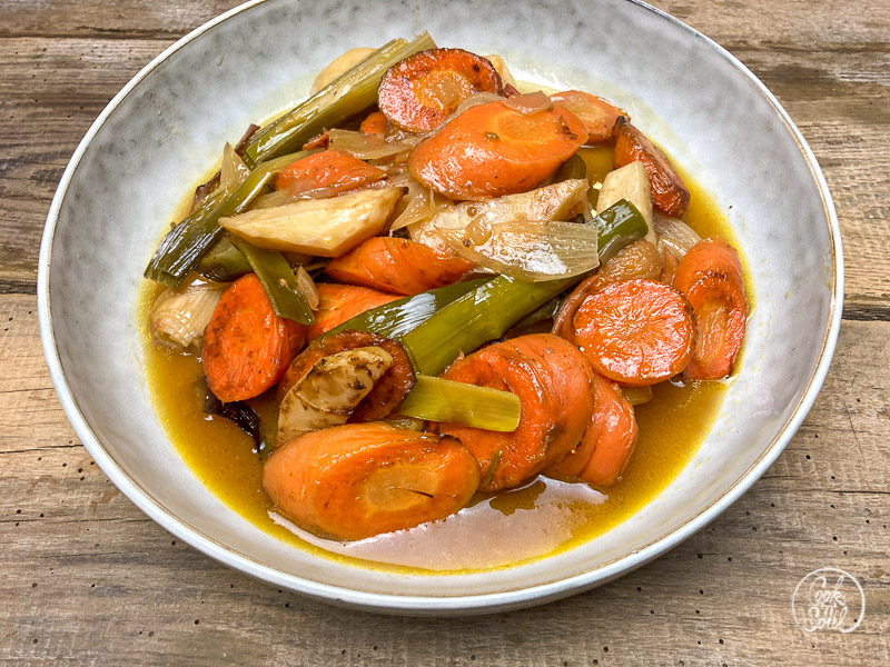 Mit der Brühe ablöschen und so lange auf kleiner Flamme köcheln lassen, bis das Gemüse bissfest aber angenehm weich ist.