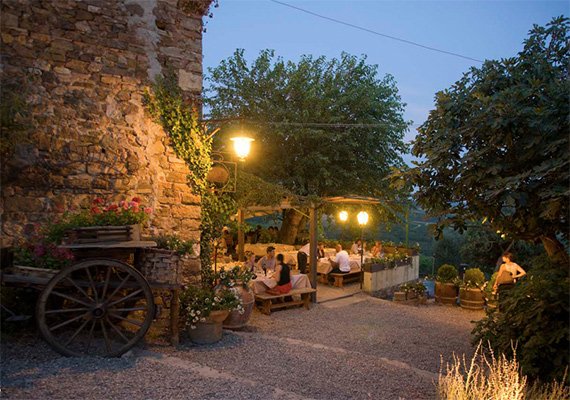 Die Asphaltstrasse wird zu einer Sandstrasse, die Besucher zunächst durch einen dichten Steineichenwald führt, bevor ein kleines Marienbild den rechten Weg zur Cantinetta weist. Dieses alte, liebevoll restaurierte Gasthaus bietet typische toskanische Küche, modern interpretiert. Idealerweise setzt man sich zum Mittagessen auf die einladende Terrasse und genießt dort zum Beispiel ein Bistecca di Fiorentina zusammen mit einem Chianti Classico der Fattoria di Rignana.