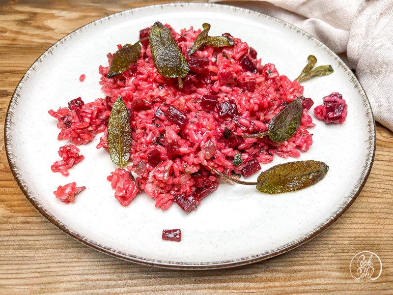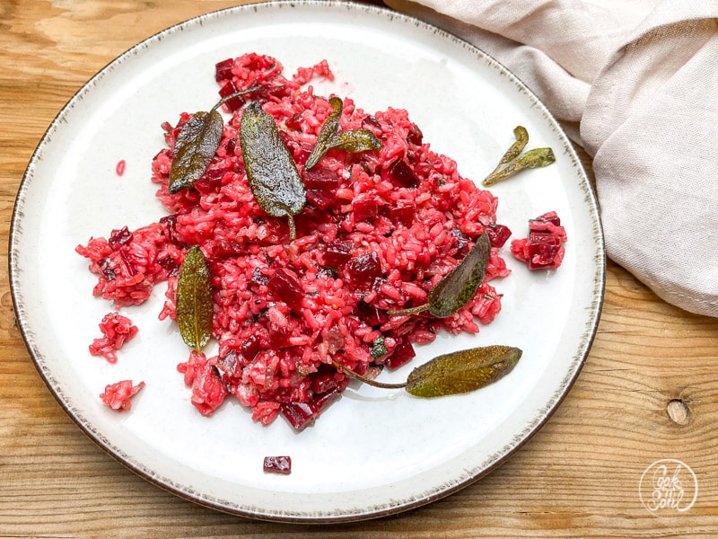 Risotto auf Tellern anrichten, die ganzen Salbeiblätter als Garnitur oben drauf legen und sofort genießen.