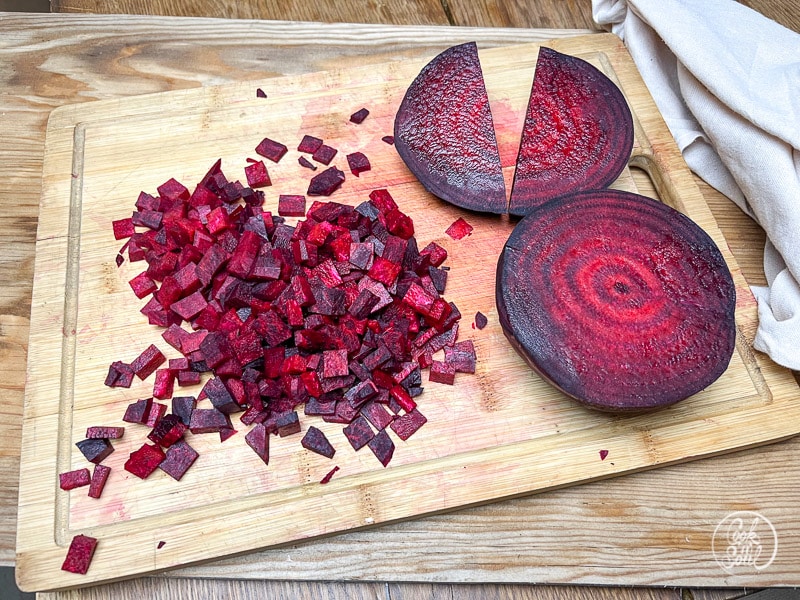 Rote Bete gründlich waschen, Stielansatz, Wurzelspitze und eventuell schadhafte Stellen ausschneiden. Rote Bete in kleine Würfel schneiden.