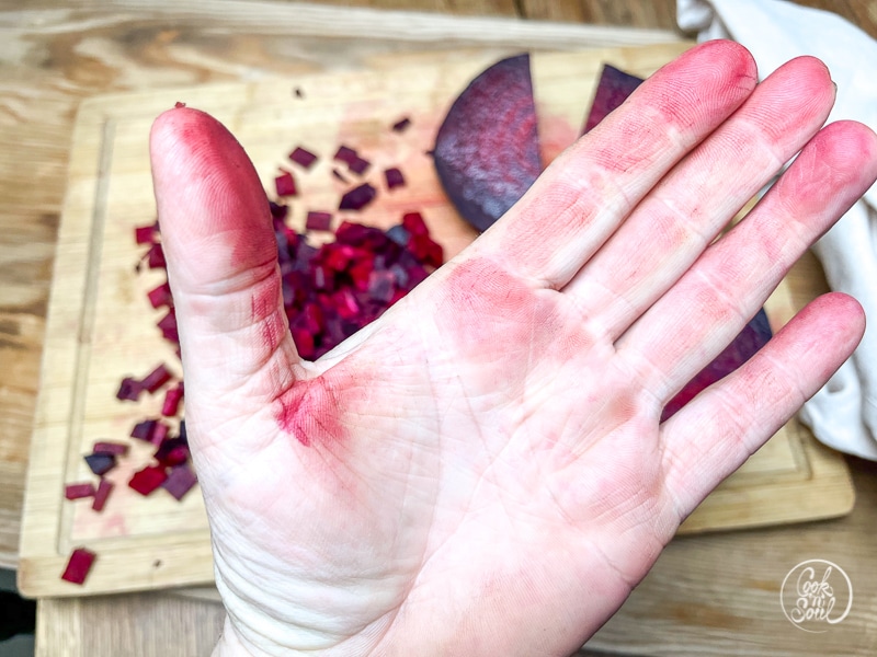 Tipp: von der Roten ete gibts schnell auch rote Finger, aber das ist keineswegs schlimm, denn die Farbe lässt sich auch ganz einfach wieder mit der Nagelbürste abschrubben. Auf Einweghandschuhe würde ich daher (schon aus ökologischen Gründen) immer verzichten ;)