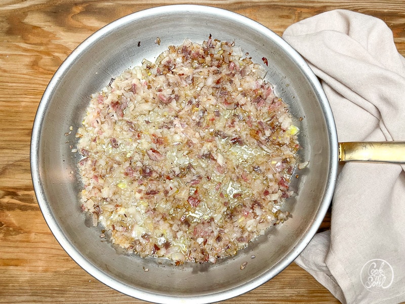 In einem ausreichend großen flachen Topf oder einer großen Pfanne den Butterschmalz erhitzen. Zwiebeln darin bei mittlerer bis kleiner Hitze glasig dünsten.