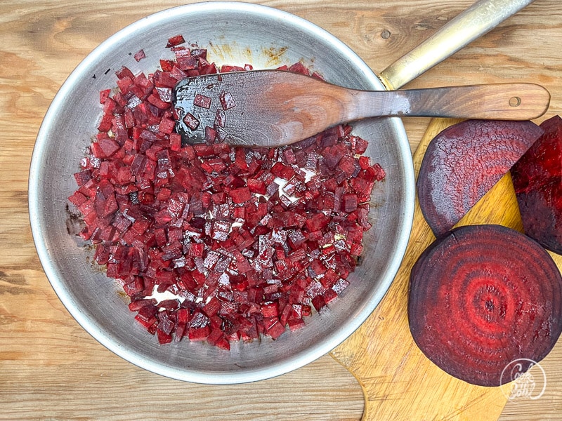 Rote Bete Würfel in einer Pfanne mit etwas Fett rundrum kräftig anbraten, damit sie ein paar Röstaromen bekommen.