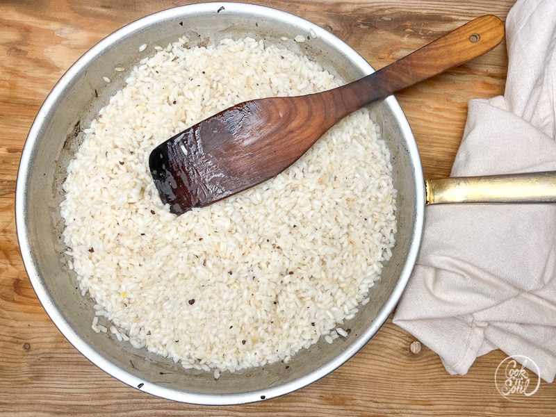 Risottoreis in eine Pfanne ohne Fett geben, kurz anrösten und dann mit dem Weißwein ablöschen.