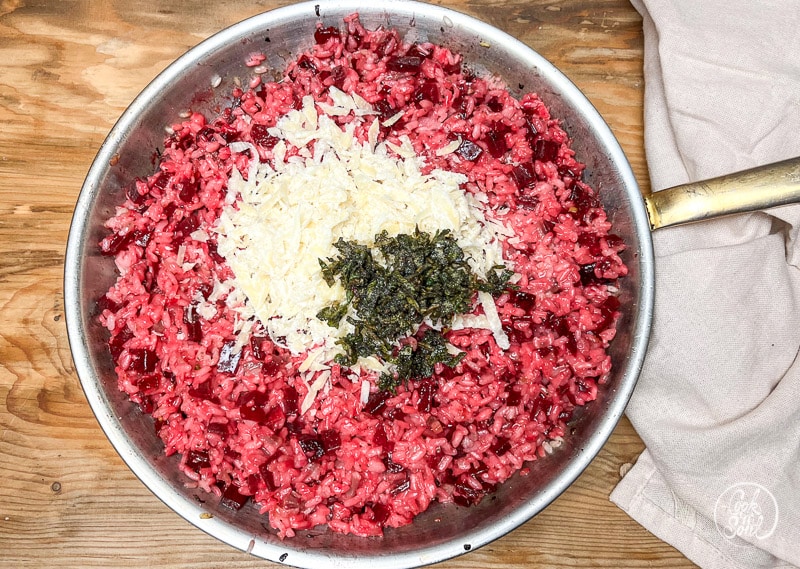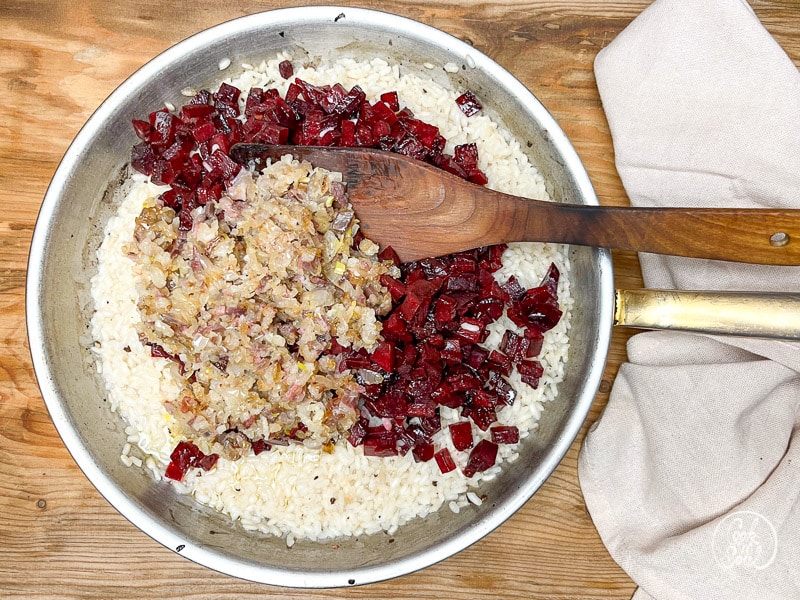 Angebratene Zwiebeln, Knoblauch und Rote Bete Würfel in die Pfanne zu dem Risottoreis geben.