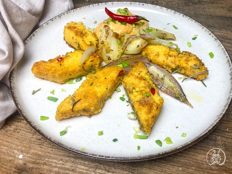 Sobald die Polenta eine stichfeste Konsistenz hat, kannst Du sie in Ecken/Streifen schneiden und in einer Pfanne mit etwas Fett ausbraten.